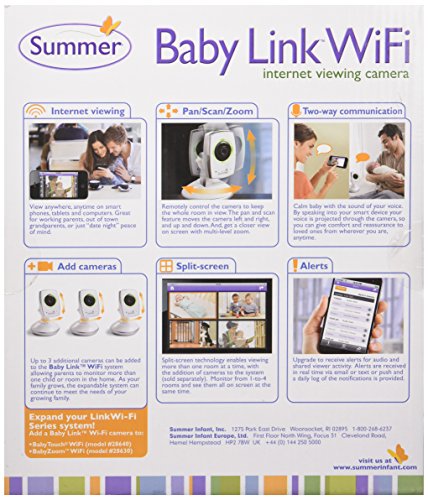 Advanced technology: view on smartphones, tablets and laptops in home or away via free summer link Wi-Fi application for Apple and Android; Expandable system add extra cameras to monitor multiple children or rooms, up to 4 total, Remote Control: Pan, scan, zoom camera allows parents to keep a mobile baby in view; Two way communication; Monitor room temperature, with option for Fahrenheit or Celsius reading; Share viewing access with friends and family, Wi-Fi camera: Automatically connects to home wireless network for secure in home and remote viewing; Internet status lights indicate connectivity states; Infrared LEDs enable monitoring in darkened rooms and overnight, App features: snapshot pictures stored on mobile device; Record a Video video stored on mobile device; Privacy mode control/restrict access for out of home viewing; Split screen view 1-4 rooms on same screen when cameras added to system, Warranty: 1 year manufacturers warranty