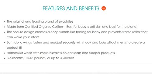 The original and leading brand of swaddles;Made from Certified Organic Cotton, best for baby's soft skin and best for the planet;The secure design creates a cozy, womb-like feeling for baby and prevents startle reflex that can wake your infant;Soft fabric wings fasten and readjust securely with hook and loop attachments to create a perfect fit;Harness slit works with most restraints on car seats and sleeper products