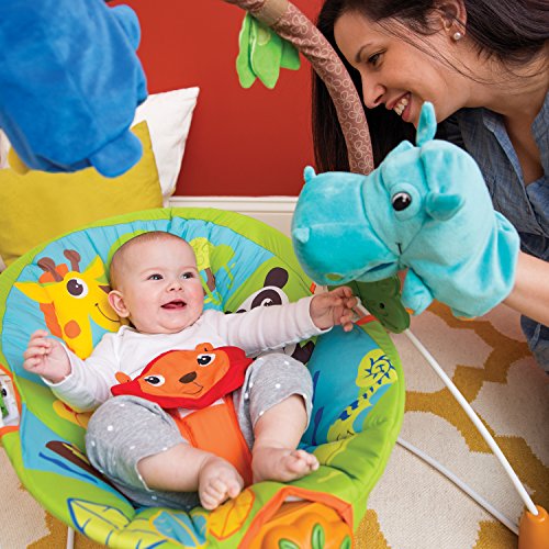 Includes two large plush interactive hand puppets: toucan and hippo, Newborn full body and head support, 2 position recline with 3-point safety harness, Melodies, sounds, and vibrations soothe and entertain baby