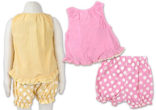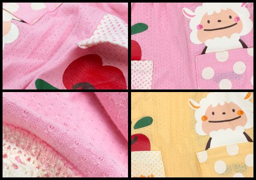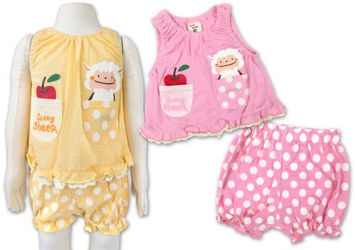 超人気サニーシープのキャミの左右についたポケットがトレードマークのキャミスーツです 肌ざわりの良い透かし編みの針抜き天竺使用 ポケットからひょっこりとひつじちゃん&リンゴのプリントがカワイイッ キャミの裾は軽いひだ入り&レースになっています。 裾ゴム入りのショートパンツは水玉柄でさらにCUTEに☆ セットアップなのがとっても嬉しいっ お色はピンク、クリームの2色展開です サイズ: 80cm/90cm/95cm カラー: ピンク/クリーム 素材: 綿100% 原産国: 中国
