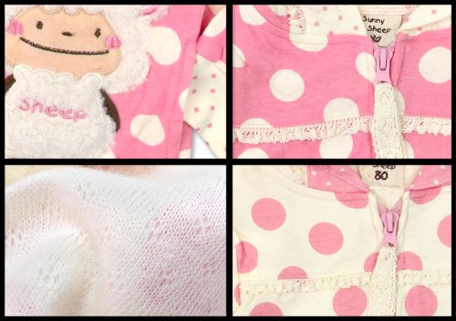 超人気サニーシープのところどころについたレース使いがCUTEなみずたま柄パーカーです☆ 薄手の天竺を二重織にし、ところどころを接結した素材でやわらかい肌触りの接結天竺使用 フード部分裏地は、保湿性・伸縮性に優れたスムス綿100素材使用。 フード部分、胸もと、ファスナーの取って部分にレースが☆ 両サイドにはポケット付きなのも嬉しいっ(^○^) 前身ごろ左側にはリンゴを頭に乗せたひつじちゃんアップリケ お色はピンクとアイボリーの2色展開 サイズ: 80cm/90cm/95cm カラー: ピンク/アイボリー 素材: 本体・綿100% リブ部分・綿95% ポリウレタン5% 原産国: 中国
