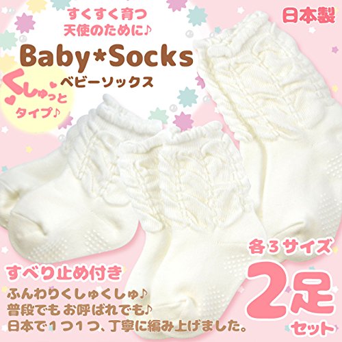 可愛いいベビー靴下2足セット。くしゅくしゅとしたクルーソックスで足底に安心のすべり止め付き。安心の日本製でお祝いギフト、お誕生日などの贈り物にお勧めです。
