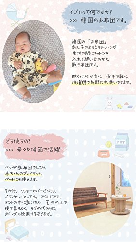 韓国の「お布団」刺し子のようなキルティング生地の間にコットンを入れて縫い合わせた敷き布団です。触り心地が良く、薄手で軽く、洗濯機で気軽に丸洗いできます。ベッドの敷布団でしたり、赤ちゃんのプレイマット、ペットにも使えます。Susabiのイブルは韓国の有名な百貨店に卸しをしている工場で生産しています。 ピグメント製法という特殊な染め方をしています。 高温で煮る事でカラーを入れ、生地を殺菌するだけではなく、柔らかさと肌ざわりの良さを作り出しています。