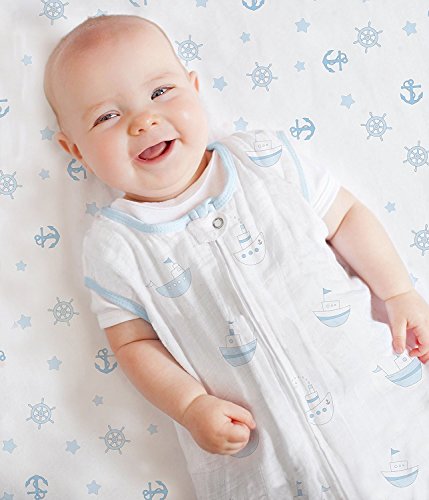 Style:Blue Ahoy! Soft, breathable, lightweight cotton muslin fitted sheet will encourage sweet zzZs. Fully elasticized, designed to securely fit standard US crib mattresses of 28 x 52 x 6 inches. Your baby will enjoy the comfort of 100% premium cotton muslin, so you both rest easy. SwaddleDesigns cotton muslin is pre-washed to increase softness and we use premium cotton yarns to increase durability and minimize pilling. Coordinates with a variety of our quality baby essentials. Machine wash gentle.