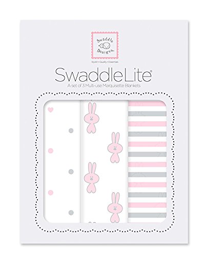 SwaddleDesigns SwaddleLite, Set of 3 Marquisette Swaddle Blankets, Premium Cotton Muslin, Pastel Pink Little Bunnie Lite