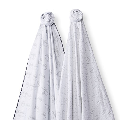 SwaddleDesigns SwaddleDuo, Set of 2 Swaddling Blankets, Cotton Muslin + Premium Cotton Flannel, Sterling Owls and Sparklers Duo