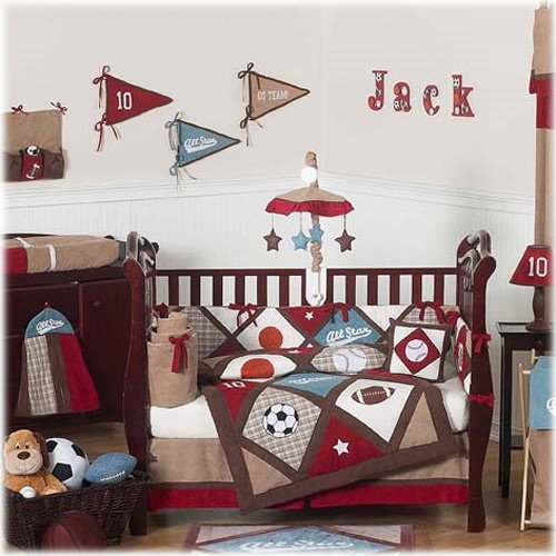 All Star Sports Red, Blue and Brown Baby Boy Bedding 9pc Crib Set by Sweet Jojo Designs