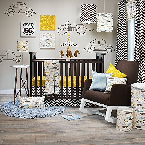 There's a traffic jam on Route 66 and you won't want to miss it. Vintage pickup trucks, roadsters, VW bugs, motorcycles and station wagons create retro fun in this classic baby boy's bedding collection. Yellow polka dots and chocolate chevron add stylish color and on point design for today's nursery. Quilt features chocolate trim and a super soft backing for ultimate comfort. Yellow polka dot sheet is fully elasticized for a secure fit that won't slip. Chevron crib skirt has a 16' drop. Decorating the nursery has never been easier. Wall decor includes a variety art including fabric covered canvases, framed prints with glass, large wall decals and hooks for hanging items. Coordinating essentials range from matching hamper and waste can to Ubbi diaper pail covers, table lamp, and hanging drum shades. Hand made in the USA for quality, comfort and design you can count on.