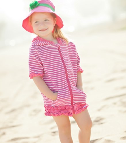 UPF50+の最強UVカットラッシュガードで大人気のSwimZipよりビーチカバーアップです。 もちろんこちらもUPF50+で有害な紫外線98%をシャットアウト! 紫外線対策に、冷え防止に、タオル替わりにとビーチや海で大活躍すること間違いなし!一枚持っていると便利なアイテムです。 フード付なので頭まで守ってくれます。少し長めの丈でお尻までカバーします。 軽いタオル時は中央にジッパー付で着脱も簡単。 機能性のみならず可愛らしいフリルのデザインでビジュアル的にも素敵です。