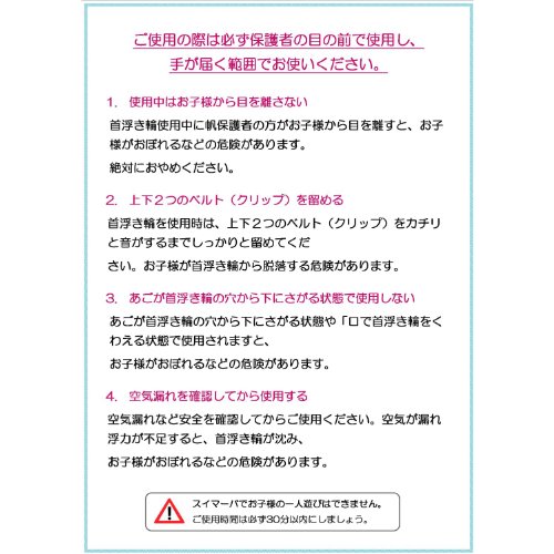 - ・深い水深でのご使用は、本製品が脱落する、お子様の首が締め付けられるといった危険がございます。