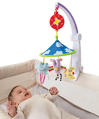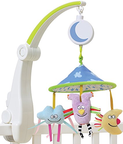 A classic product with a refreshing design. For Newborn +;Wind-up music box with smiling sun cover;Clip attachment fits most fabric cots;Colorful wind up music box.;Night themed canopy and 3 hanging toys - owl, moon and cloud
