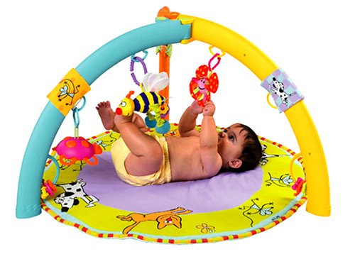 マットとバーがそれぞれ独立でき、3本のバーは折り畳む事が出来るので、持ち運び・収納に便利なジャンボジム。直径87cmのカラフルマットには、色々な動物のプリントがあり、指差しながらお話できる。ラトルにもなる「虫さん」はミラーになっている。足が伸び縮みする「ハチさん」、スマイルフェイスの「お花さん」など飽きないオモチャがいっぱい。お花を押すとモーツァルトのメロディーが流れる。