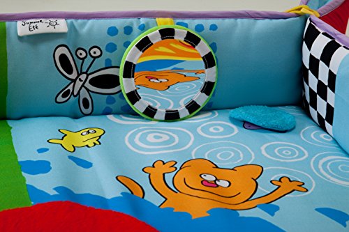 Generously sized 40 x 40 inch (100cm x 100cm) and thickly padded.;With side panels that raise to keep baby cosy and safe.;Four vibrantly coloured base panels each depict a different season of the year with fun, comical illustrations and textures, surrounding an extremely soft, appealing fabric centre.;3 detachable toys will further your baby's exploration of the seasons, including a rattling ball, ring rattle teether and baby-safe mirror, plus 3 peek-a-boo flaps.;Suitable from birth.