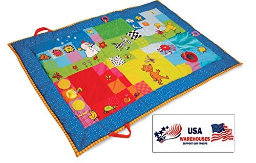 Touch Mat is soft, thickly padded mat featuring colorful illustrations with high contrast black and white patterns to encourage new-borns to focus and develop visually.;Lots of fun toys for baby include Teether, Plastic rings, beads, Squeaker, Baby safe mirror, Hide-and-seek Activities, Crinkling Patches and lots of different textures;Features convenient carry handles, for easy transportation when folded.;Ideal for children age 0 months +;Oversized play area: 59 x 39 x 1.6 (100 x 150 x 4 cm)