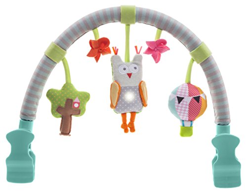 Super soft and richly colored arch is full of musical surprises.;Gentle music will be activated and lights will twinkle when baby touches the Owl toy.;Fits easily onto most prams, infant car seats or bouncers by means of two large sturdy clips;Includes a rattling balloon and jingly tree.;Replaceable batteries included