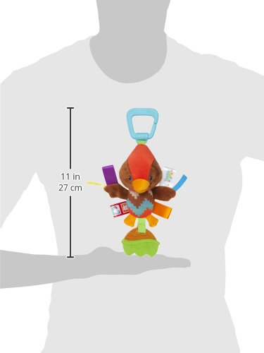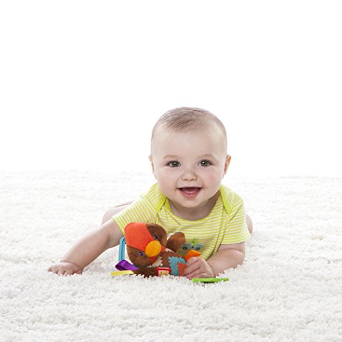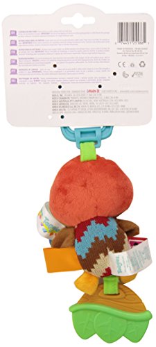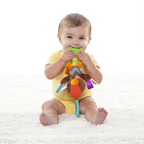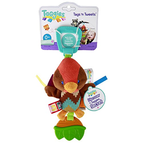 Soft plastic teether with multiple textures;4 plus signature taggies satin loops for baby to explore;Fun chirping noises;Attaches to play gyms, carriers, strollers and more, for on-the-go fun