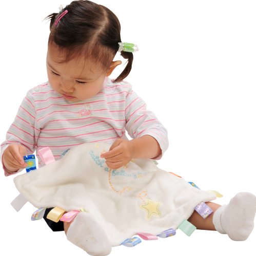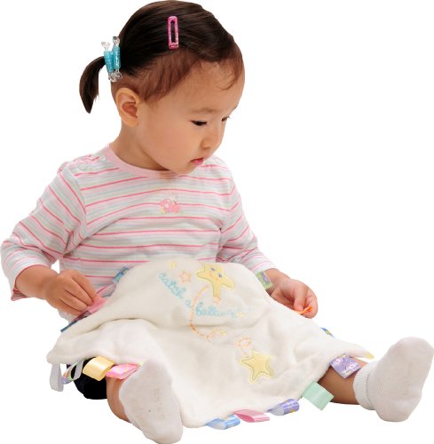 高品質で触り心地抜群の生地と、周りにたくさん付いたカラフルなタグがベビーの気持ちの落ち着きを手助け。外出先でも、お家でも、ブランケットとしてオモチャとしてベビーの成長を見守る。