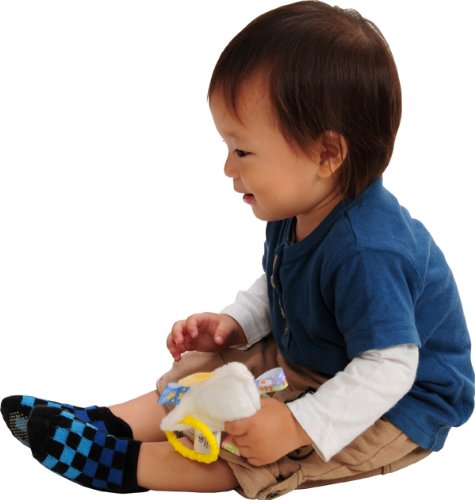 高品質で触り心地抜群の生地と、周りにたくさん付いたカラフルなタグがベビーの気持ちの落ち着きを手助け。外出先でも、お家でも、ブランケットとしてオモチャとしてベビーの成長を見守る。