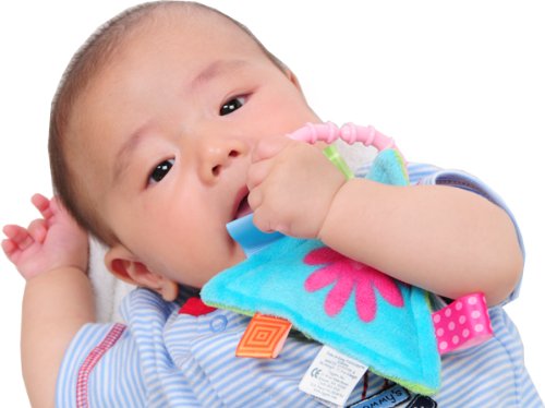 高品質で触り心地抜群の生地と、周りにたくさん付いたカラフルなタグがベビーの気持ちの落ち着きを手助け。外出先でも、お家でも、ブランケットとしてオモチャとしてベビーの成長を見守る。