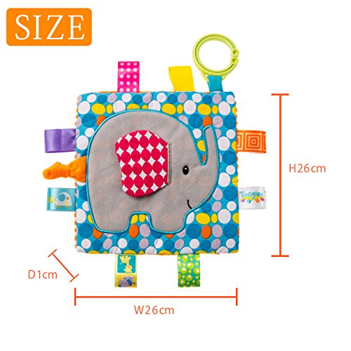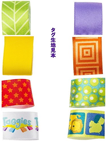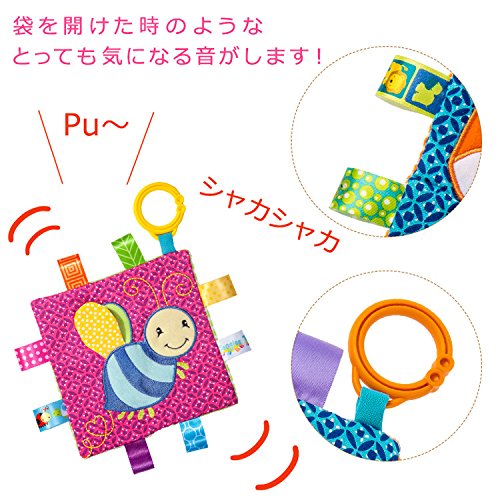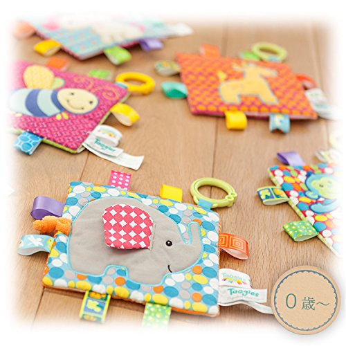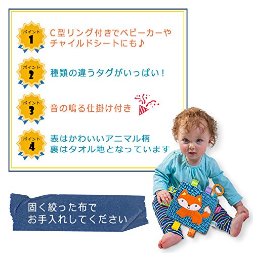 肌触りの違うタグがいっぱい。かさかさ、つるつる、でこぼこ・・・いろいろな触感が赤ちゃんの指先の感覚の発育を促します。中には赤ちゃんが大好きなシャカシャカ音の鳴る仕掛けが!ベビーカーやチャイルドシートにも取り付けられるC型リングが付いているのでお出かけにも便利なタオルです。表はかわいいアニマル柄(キリン)、裏はタオル生地になっています。
