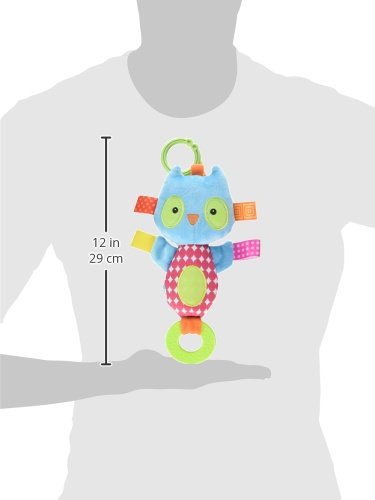 Crinkle owl squeaker toy and teether is 8-inches; includes flexible loop for attaching to stroller and crib;Features super soft fabric, embroidered face details, and chewable teether;Adorned with interactive and soothing tags babies love to explore; crinkle paper in limbs adds to the sensory fun;Great for little hands; give the body a good squeeze and owl lets out a squeak that'll make baby smile;Taggies toys, blankets and baby mats make great coordinating baby shower gifts
