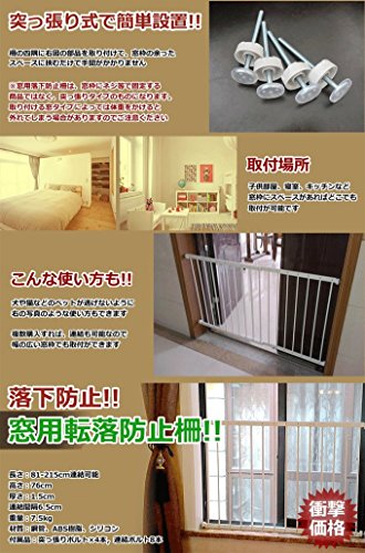 注意事項 ※窓用落下防止柵は、窓枠にネジ等で固定する商品ではなく、突っ張りタイプのものになります。 ※取り付ける窓タイプによっては体重をかけると外れてしまう場合がありますのでご注意ください。 ※こちらは簡易タイプの為、強い衝撃を与えると破損する場合があります。 転落事故を未然に防ぐ、突っ張り式で簡単設置!!! ◆子供の落下防止に!!! 好奇心旺盛な子供は窓枠などによじ登ってしまい、それが事故につながる事も少なくはありません。 特に子供を留守番させてちょっとお買いものに出ている間に・・・なんてことも。 なので、窓に柵を付けておけば、そういった事故を未然に防ぐことができます。 ◆突っ張り式で簡単設置!! 柵の四隅に右図の部品を取り付けて、窓枠の余ったスペースに挟むだけで、手間がかかりません。 複数購入すれば、連結も可能なので幅の広い窓枠でも取付ができます。 長さ:81-215cm連結可能 高さ:76cm 厚さ:1.5cm 連結間隔6.5cm 重量:7.5kg 材質:鋼管、ABS樹脂、シリコン 付属品:突っ張りボルト×4本、連結ボルト8本 製造:中国 ※柵と柵を繋げる時にご確認ください。 ネジを通す穴に穴を開けた時に金属片(バリ)が残っている場合があり、 ネジが通りにくい場合があります。 このような場合はドライバの先などで金属片(バリ)を押し込んでから(簡単にとれます) ご使用ください。