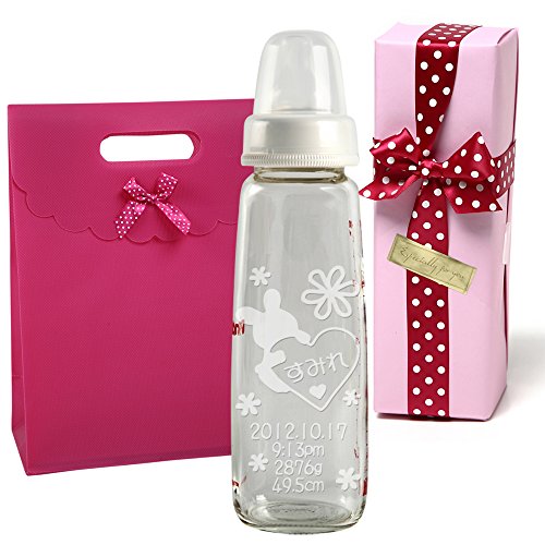 TEATSIGHT お名前入り 哺乳びん 名入れ 彫刻 フラワーラビット 240ml ガラス製 (ピンクラッピング)