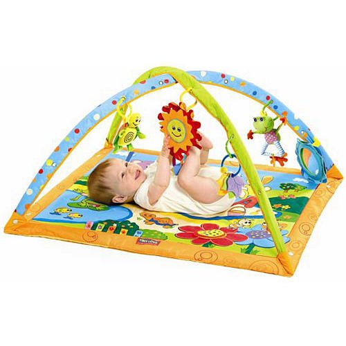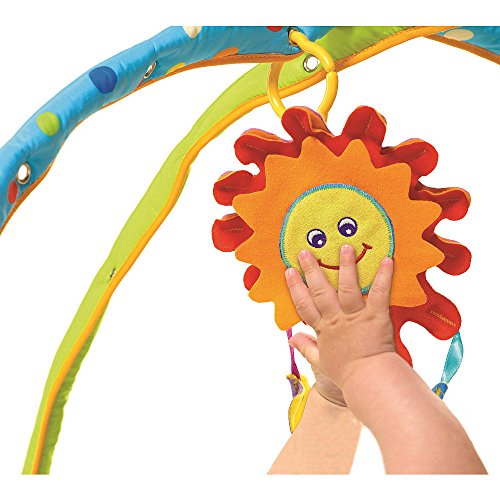 TINY LOVE社製, 3つの音を奏でる太陽などかわいいぶらさがったおもちゃたちが赤ちゃんの好奇心を刺激します。 カエルは引っ張って手を離すと震え、太陽をたたくと音楽が流れます。 タミータイムに楽しめる鏡付 約幅87×奥行き75×高さ42cm 素材:ポリエステル・綿・セロファン・ABS・PETG 使用電池:アルカリボタン電池LR44 ×3個 メーカーより:赤ちゃんの身体感覚と運動能力を刺激するために腹ばいに寝かせましょう