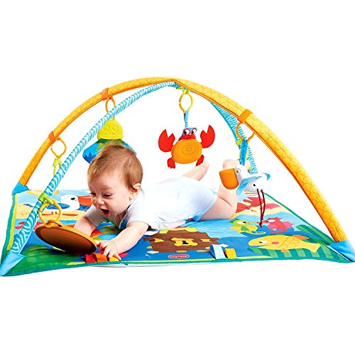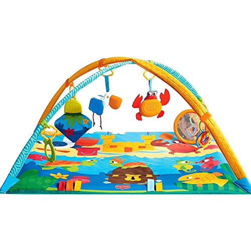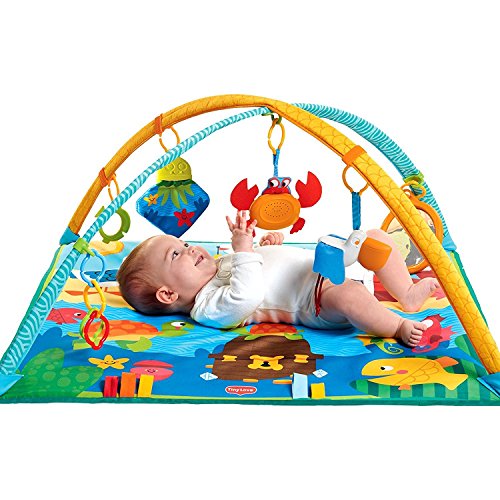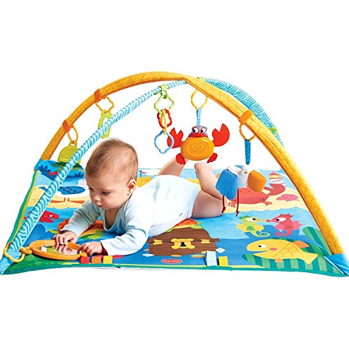 Moderate the level of stimulation offered by the Gymini Under the Sea by moving the arches and toys away or towards your baby and turning the lights and music feature on or off. At 1-3 months, move the toys within your baby's reach and allow them to explore their smiling expressions and take their first batting attempts. Over the next few months use the mat's fun features to engage your baby and help extend tummy time, playing with the electronic crab or crinkly jellyfish. At 6-9 months, let your baby enjoy the stimulating features of the baby-activated electronic crab toy and learn about cause and effect through exploration.
