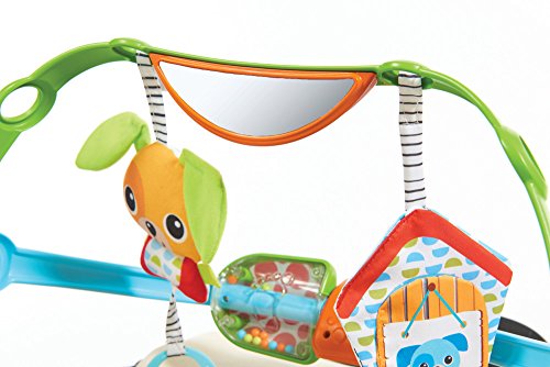 Reinforces self-discovery and cognitive development with a wide selection of fun features and toys: rotating rattling paddles, crinkly peek-a-boo book, puppy rattle and more;Uniquely designed with stimulating activities for babies hands AND feet;Designed with contrasting colors that stimulate baby;Reinforces baby's self-discovery and cognitive development;7 page Crinkly peek-a-boo book to encourage curiosity
