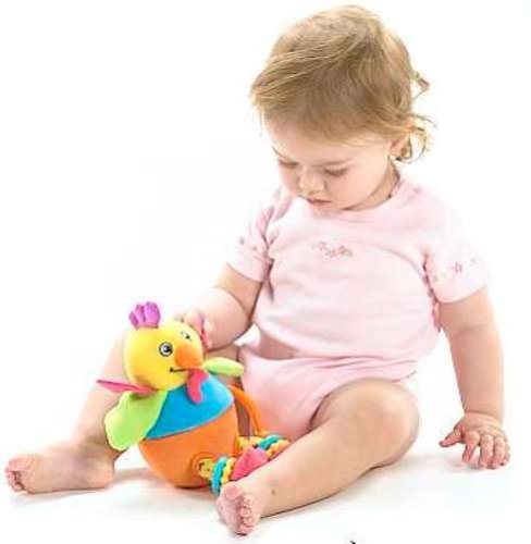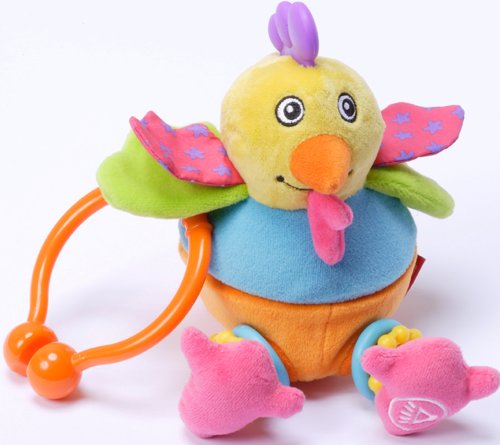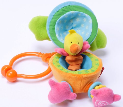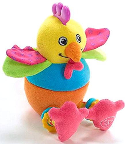 お腹を開けると可愛いヒヨコさんが 登場します。そして 左足の裏を押すと元気な鳴き声をだします。右足は カラカラと 音がします。とさかは 歯固めになっています。羽はカサカサと音がします。クリップで ベビーカーにもぶら下げられて 便利です。