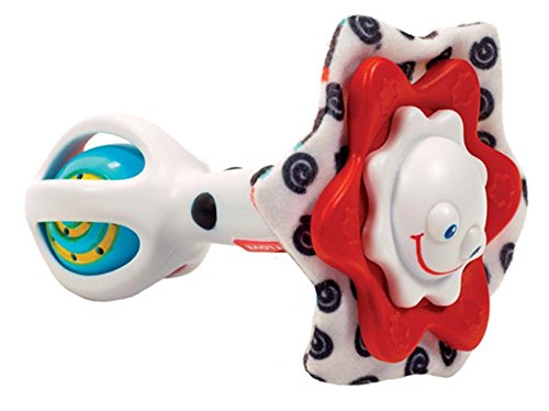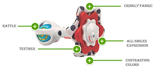 Star-shaped rattle with sweet smiling expression;Contrasting red, black, and white design stimulates baby's senses;Easy to grasp and hold;Engaging features, such as rattling ball and crinkly cloth