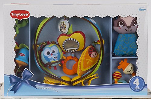 Simple decision-making for gift giver! Deluxe gift set containing a Woodland take-along stroller arch, Pack & Go Mini Mobile, Tiny Smarts Crinkly Raccoon and Tiny Giraffe Teether-Rattle