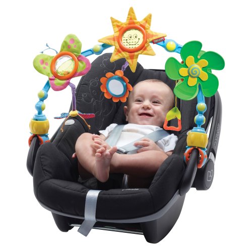 形がカンタンに変えられるフレキシブルアーチのトイバー。ベビーカーやチャイルドシートに取り付けできます。太陽さんの透明なプリズム、クルクルまわるプロペラ、チョウチョさんのガラガラやお花のミラーなど、楽しい仕掛けがいっぱいついています。取り付けはカンタン!便利なクリップ式で、アーチは前後にも動きますよ。サイズ:約幅45×奥行6×高さ30cm、重量:約780g。素材-布部分:ポリエステル・綿、樹脂部-ABS・ポリアセタール・ポリプロピレン。中国製