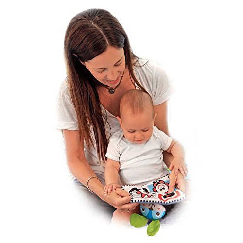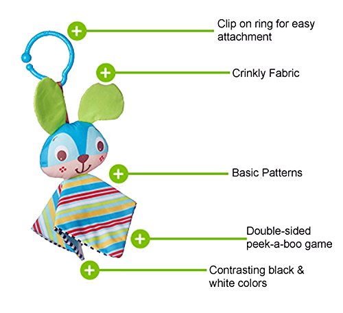 An adorable, crinkly on the go clip on toy for indoor and outdoor fun and engagement. Crinkly sound entertains baby. Colorful designs and an all smiles expression. Plastic ring easily attaches to gyms and activity mats.