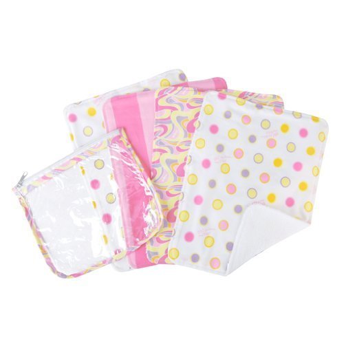 Set features four burp cloths packaged inside a matching clear reusable dirty duds pouch.;Burp Cloths: 13 in x 10 in;Dirty Duds Pouch: 10 in x 8.25 in.;Each burp cloth has a fun, modern print on the front and soft terry on the back.