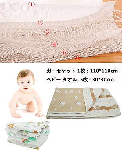 - ❥ガーゼケット: 吸湿性、保温性に优れたガーゼを六枚重ねることで, 夏場はしっかりと汗を吸収し、冬場は暖かさを逃さず、一年を通じて使えます。❥ベビー タオル: ガーゼは、吸水速乾、洗うほどに柔らかく、使い込んでも硬くなったりしません。
