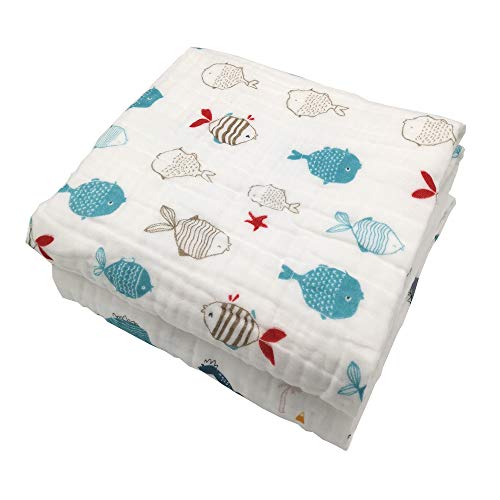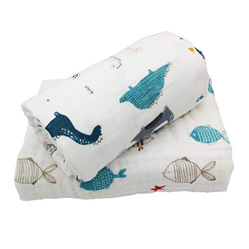 TMVOK ガーゼケット ベビー バスタオル 6重 タオルケット 赤ちゃん 2枚 110 * 110cm 出産祝い かわいい動物柄 柔らかく 沐浴ガーゼ ブランケット 男の子 女の子 保育園 2枚セット(恐竜柄 魚柄)