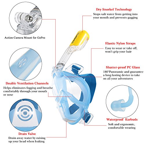- シュノーケル技術。フルフェイスマスクはシュノーケルのマウスピースをくわえる必要がないので、泳いでる最中によくあったマウスピースを噛み過ぎで顎が痛いという現象ともさよならできます。