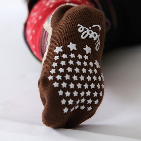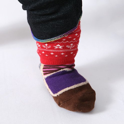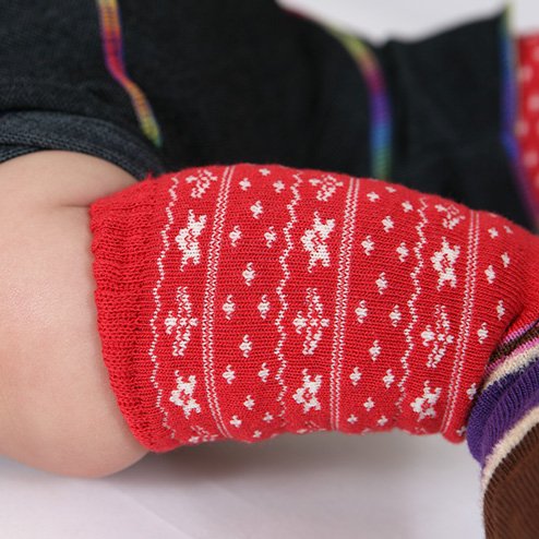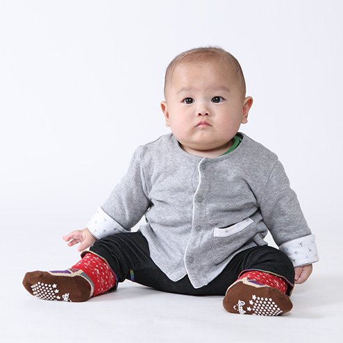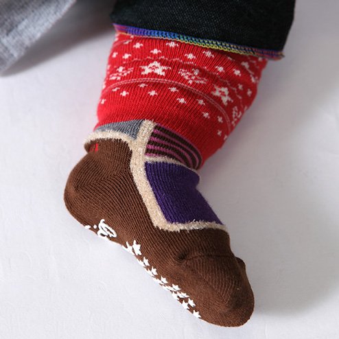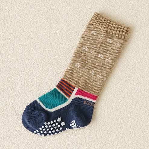 ショートブーツにジャガード柄のソックスをコーディネートしているかのよう♪ まだ靴を履けないベビーでも足元までオシャレにキメたい!というママの声にこたえて誕生です。 ハイソックス丈は、元気に動いてもずれにくいのがgood! トップのゴム口はソフトに仕上げています。