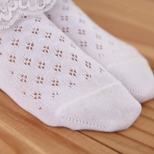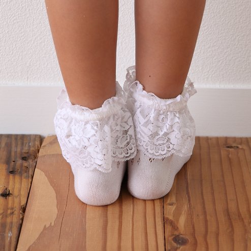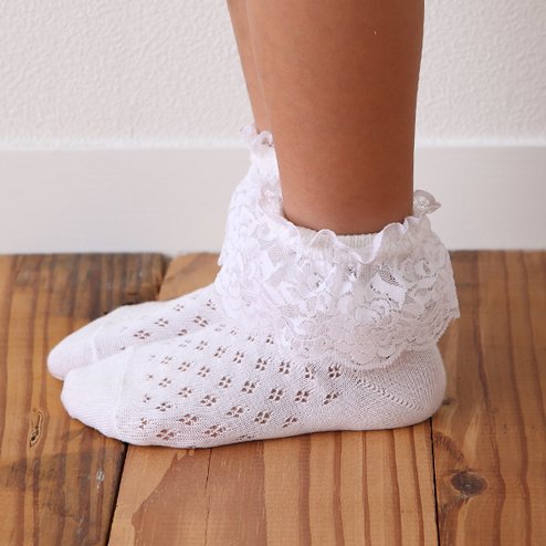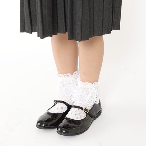 大きなレースがポイントのキッズ用メッシュレース付ソックス。 お子様の晴れ舞台、入園・卒園、入学式や発表会、七五三 結婚式などイベント時に履いていただける 上品な可愛さがポイントの一足です。 ※こちらは19〜21cmです