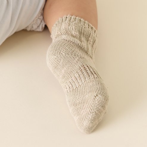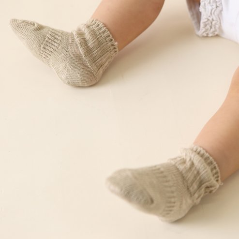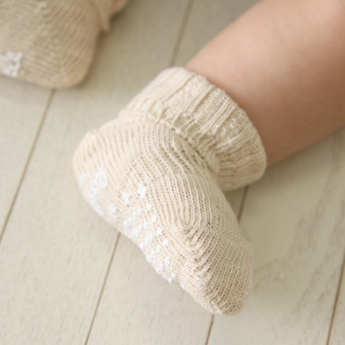 自然の優しいカラーのオーガニックコットンを使ったベビー用(半年から1歳まで)の靴下です。裏糸がないゾッキ編みになりますのでワンサイズ(11.0〜12.0cm)展開です。甲の部分にもサポートのゴムが入っておりますのでフィットします。