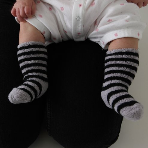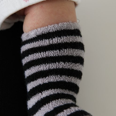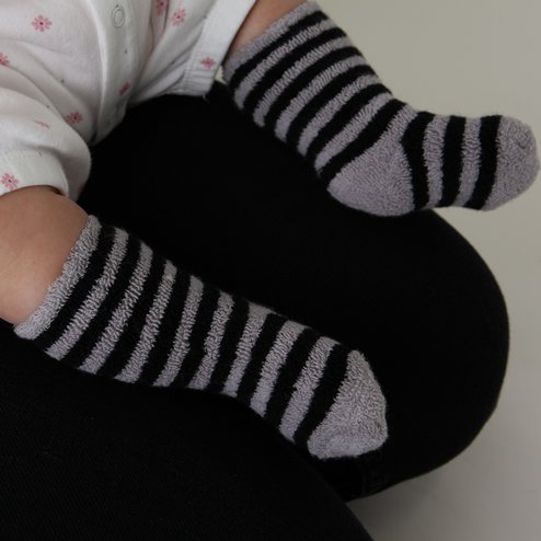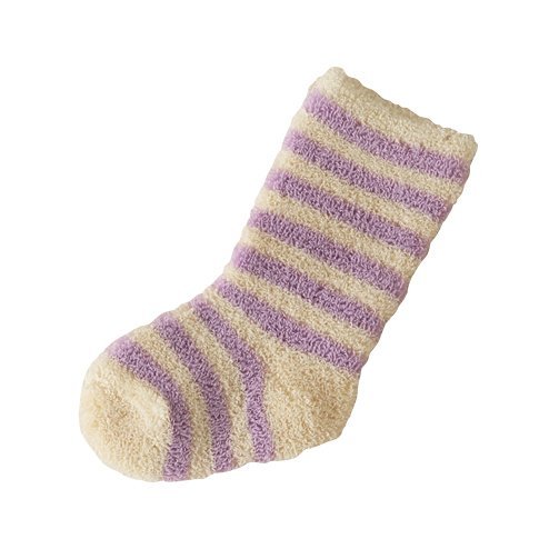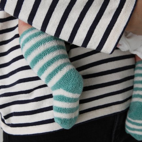 パイル素材のボーダーハイソックスは柔らかくて優しい履き心地です。
