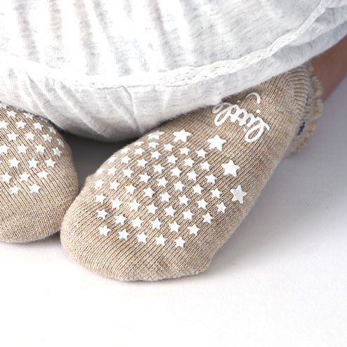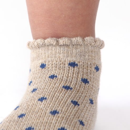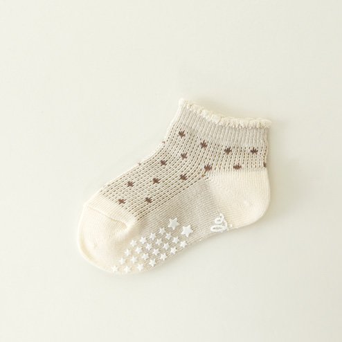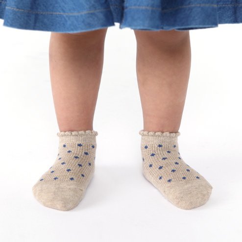 ワッフル生地に小さなドットをちりばめたベビーのスニーカー丈の靴下です。 シンプルな柄の靴下なので、どんな服装でも合わせやすい靴下です。 滑り止めつきです。