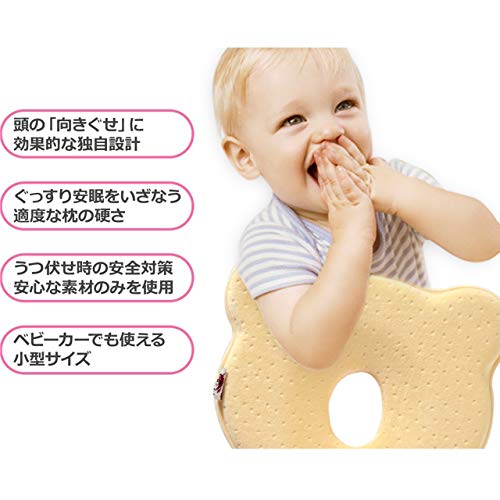 - 【特徴】枕中央のくぼみが後頭部にかかる圧力を分散、デリケートな赤ちゃんの頭をやさしく支えます。この枕を使って仰向けに寝ることで、背骨も自然な形になります。