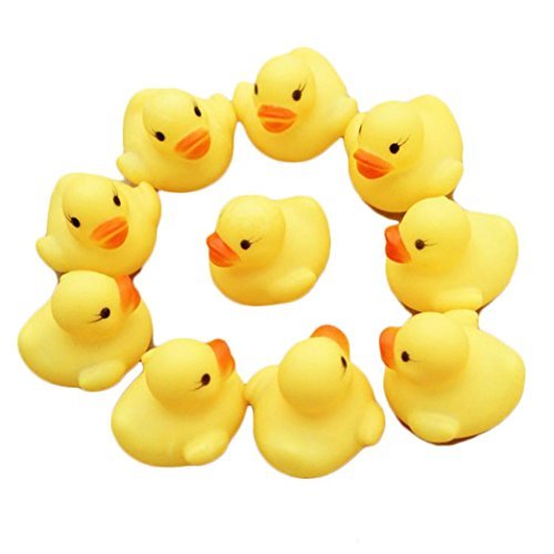 This set of 12 ducks are perfect for birthday parties and baby showers. Use as a party favor and let each guest take one home for the children to play with in the tub. Perfect size to decorate a cake, fill a goody bag, or float in a punch bowl. These float upright and have a hole in the bottom so they can squeak.;Each measures approximately:4x4x3cm;You'll receive 12 ducks;Hole in the bottom and they squeak;Decorate a cake, fill a goody bag, fun in tub or pool