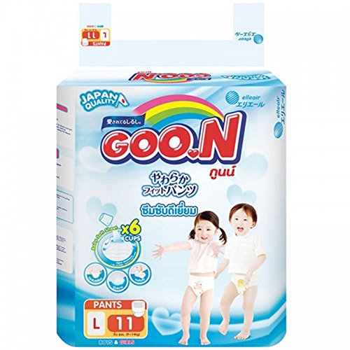 Goo.n Baby Pant Diapers Extra Boys & Girls size L 11 pcs. With A Smooth Texture Diapers And Can Be Absorbed Throughout The Disc , Thereby Not Causing Irritation. Despite Exposure To The Hands And Feet Of Children The Baby To Urinate Often But Soft On The Seat To Make The Urine Can Spread Quickly And Absorb Shock Immediately. The Baby Feels Dry And Is Always Asleep. Diapers Around The Baby'S Legs Is Still Soft . It Does Not Cause Skin Irritation And Sensitive Baby Skin. And The Size Fit Wel
