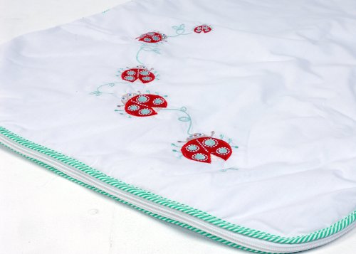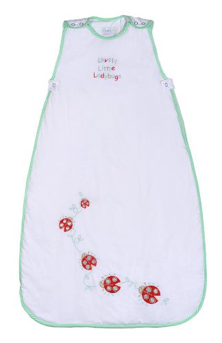 This unisex white baby sleeping bag is trimmed with thin green stripes and embroidered with five red ladybugs and leaves.;The words 'Lovely Little Ladybugs' are embroidered on the chest of the sleeping bag.;The Sleeping bag is complete with zips around the side of the bag;Material Composition : 100% cotton lining, 35% cotton/65% polyester outer, 100% polyester padding;1.0 Tog baby sleeping bags are suitable for summer months and daytime naps when nursery temperatures become warmer. For use with room/nursery temperatures between 64?F and 75?F.