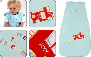 This lovely aqua blue baby sleeping bag;Many parents told us that their children are fascinated by vehicles used by the emergency services.;We chose a red fire engine as the inspiration for this new design.;Material Composition : 100% cotton lining, 35% cotton/65% polyester outer, 100% polyester padding;1.0 Tog baby sleeping bags are suitable for summer months and daytime naps when nursery temperatures become warmer. For use with room/nursery temperatures between 64?F and 75?F.