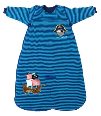 Our Pirate travel baby sleeping bag is a blue striped soft velour travel sleeping bag with removable arms.;This item is very handy if your child falls asleep whilst out and about in the car, pushchair or a buggy;The arms can be removed using the poppers placed around the top of the arm;Material Composition : 80% cotton/20% polyester outer, 100% cotton lining;3.5 Tog baby sleeping bags are suitable for winter temperatures. For use with room/nursery temperatures below 60?F.